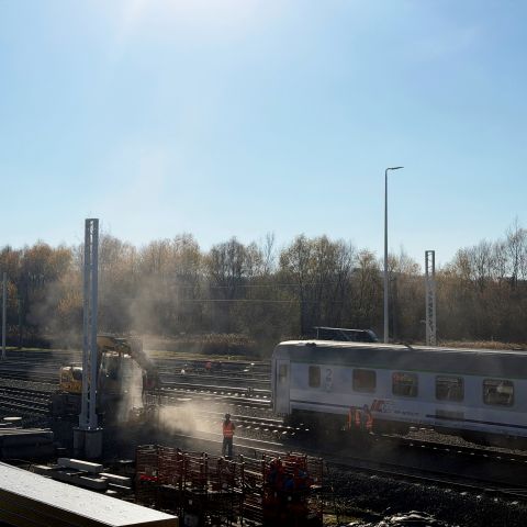 Zakończyliśmy przebudowę zjazdu z ul. Batorego – to ważny element układu komunikacyjnego, który usprawni dojazd na teren kompleksu. Równocześnie branża drogowa działa na pełnych obrotach – trwają roboty ziemne, przygotowanie podbudów oraz prace przy nawierzchniach i międzytorzach.