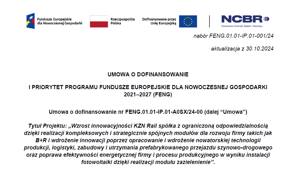 KZN Rail spółka z ograniczoną odpowiedzialnością otrzymała dofinansowanie ze środków Unii Europejskiej na projekt pn. „Wzrost innowacyjności KZN Rail spółka z ograniczoną odpowiedzialnością dzięki realizacji kompleksowych i strategicznie spójnych modułów dla rozwoju firmy takich jak B+R i wdrożenie innowacji poprzez opracowanie i wdrożenie nowatorskiej technologii produkcji, logistyki, zabudowy i utrzymania prefabrykowanego przejazdu szynowo-drogowego oraz poprawa efektywności energetycznej firmy i procesu produkcyjnego w wyniku instalacji fotowoltaiki dzięki realizacji modułu zazielenienie” w ramach Programu Fundusze Europejskie dla Nowoczesnej Gospodarki.